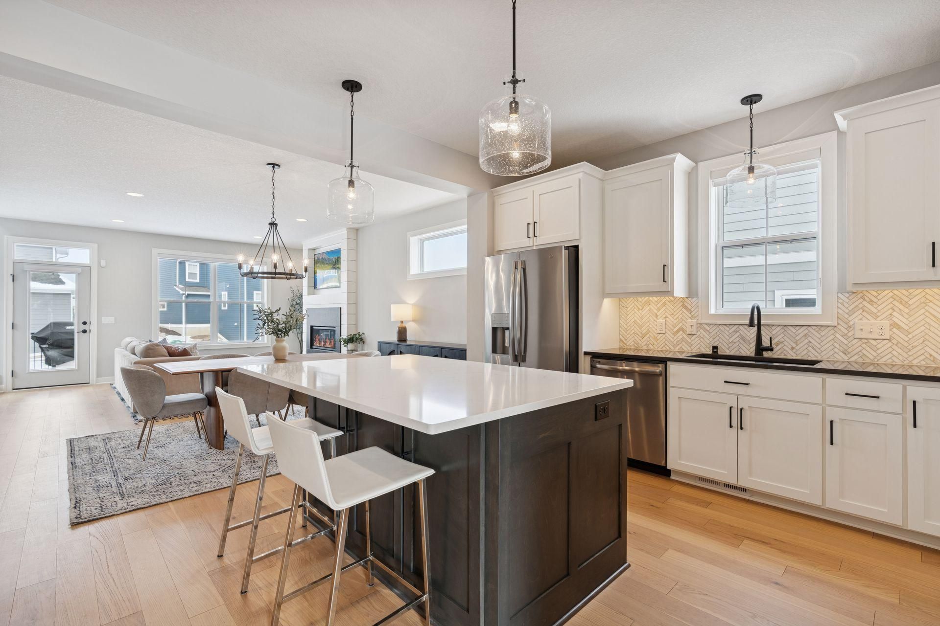 Stylish and move-in ready home in the highly sought-after Brandtjen Farm community! The open-concept main level showcases luxury finishes throughout, featuring a modern kitchen with a large center island, premium cabinetry, and designer fixtures that flows seamlessly into the dining and living areas. Floor-to-ceiling windows and a cozy fireplace create a bright and welcoming living space ideal for everyday living or entertaining. The upper level offers a spacious vaulted primary suite with a private ensuite bath, plus an additional bedroom with its own ensuite. A versatile loft provides ideal space for a home office or flex area, along with the convenience of second-floor laundry.The finished lower level includes a generous family room with sliding door access to a concrete patio and fully fenced backyard, as well as an additional bedroom, full bathroom, and dedicated storage room.Thoughtfully designed with modern style and high-end finishes throughout?this home offers comfort, functionality, and elevated living in a prime Lakeville location.