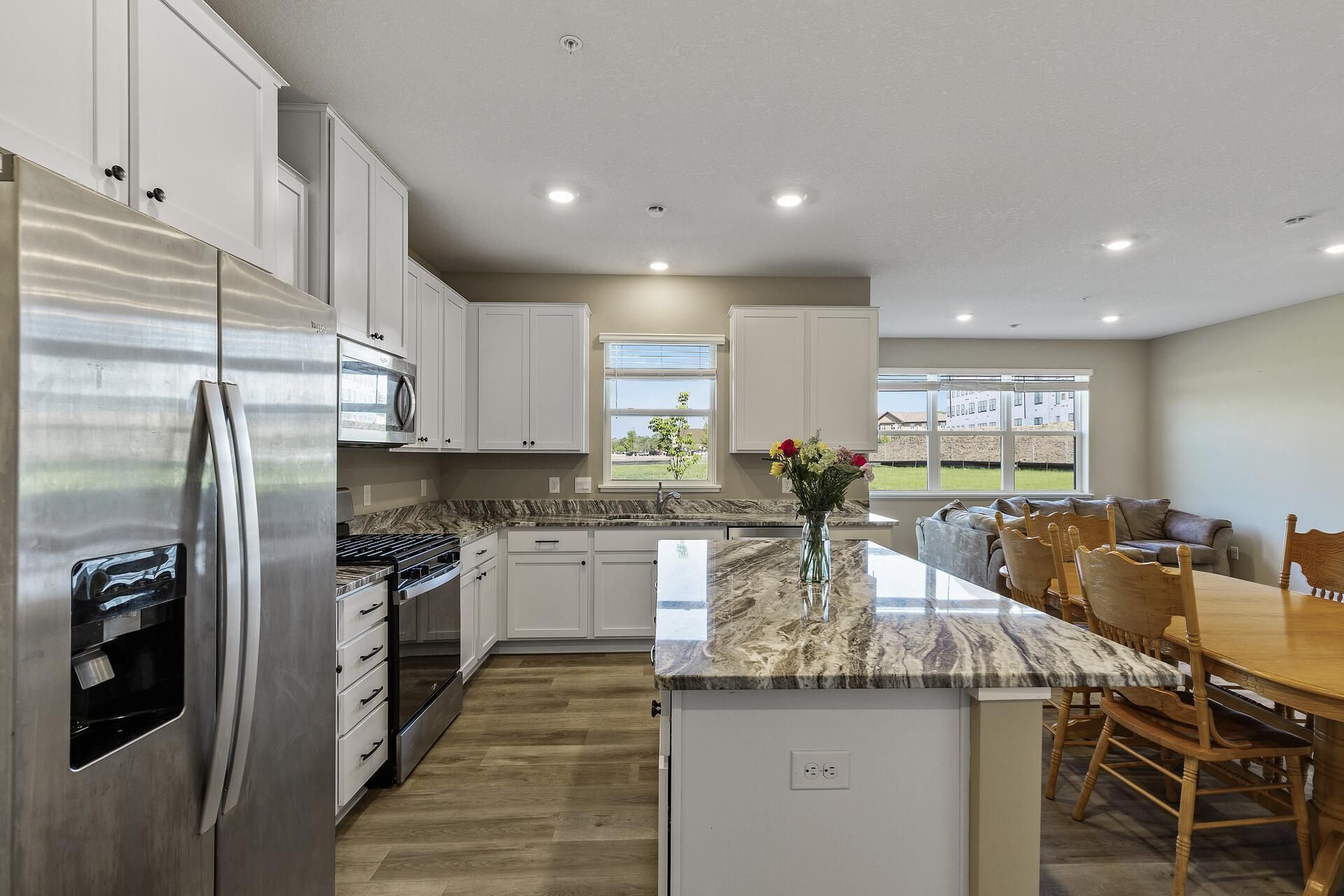 Better than new and impeccably maintained, this stunning 2-story townhome stands out from the rest with one of the most desirable lots in the development. Enjoy long, peaceful views with the added convenience of extra parking along with a longer driveway that is great for entertaining. The private dog park is very close as well. Inside, you'll find a thoughtfully designed open-concept main level featuring luxury vinyl plank flooring, a spacious family room, and a designer kitchen complete with white cabinetry, granite countertops, stainless steel appliances, and a large center island perfect for gathering and entertaining. The dining area flows seamlessly to your own private covered patio?ideal for relaxing or hosting friends. Upstairs, you'll be impressed by three generous bedrooms, including a private primary suite with its own covered balcony, a beautifully appointed ensuite bath, and a walk-in closet. A dedicated home office, second-floor laundry, and stylish bathrooms offer the comfort and functionality today's buyers are looking for. Additional highlights include a 26-foot deep two-car garage with ample storage, smart home features, a whole-house humidifier, and access to nearby trails, parks, and golf courses. This is the kind of home that makes you pause and say, 'They thought of everything. Don't miss the chance to make it yours.