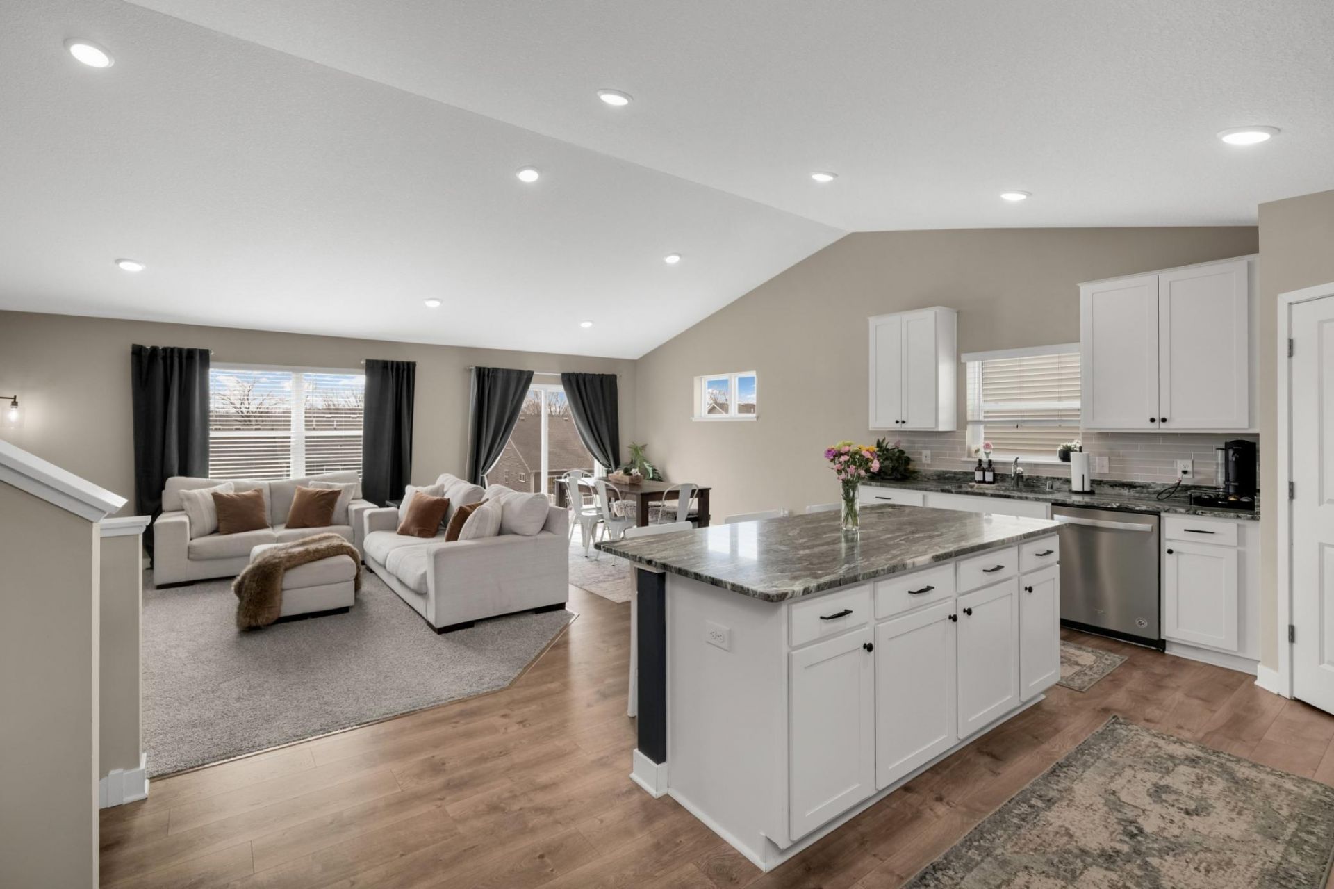 This meticulously maintained walk out home located in the Pinnacle Reserve neighborhood offers 4 spacious bedrooms, 4 bathrooms, and a versatile, main floor flex room perfect for a home office, playroom, or whatever suits your lifestyle. The open and inviting main level features stunning vaulted ceilings in a highly functional kitchen complete with stainless steel appliances, quartz countertops, a spacious corner pantry, and a window over the sink. A large center island with a breakfast bar makes entertaining family and friends effortless. The oversized primary suite offers two walk-in closets, along with dual sinks, quartz countertops, and a large 3/4 shower. The finished lower level provides excellent additional living space, including a fourth bedroom, conveniently located across from a full bath, as well as a private second living room, ideal for guest or multigenerational living. You'll also appreciate the abundance of storage throughout the home, along with its wonderful curb, appeal, a 3 stall garage, and a welcoming covered front porch. This home has so many wonderful things to offer and is located in the high view elementary school district