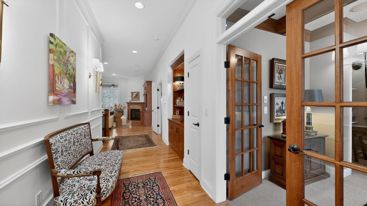 Impeccably appointed home set on a beautifully landscaped, tree-lined lot adjacent to the golf course at Rochester Golf & Country Club, yet tucked just below for added privacy. The open-concept main floor is both spacious and well-defined, featuring warm built-ins, hardwood birch floors, and inviting living spaces that flow seamlessly from room to room. The main-floor primary suite and laundry offer ease of living, while the kitchen showcases rich alder cabinetry, double ovens, a gas range, and a generous pantry. Enjoy two distinct outdoor retreats-a screened porch overlooking the wooded setting and a covered patio below, both perfect for dining and entertaining. The finished walkout lower level offers a spacious family room with a fireplace and a wet bar, extending the living space with direct access to the outdoors. Additional highlights include a finished wine room, abundant storage, and well-proportioned bedrooms filled with natural light. HOA provides lawn care and snow removal for carefree living.